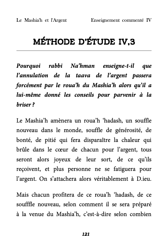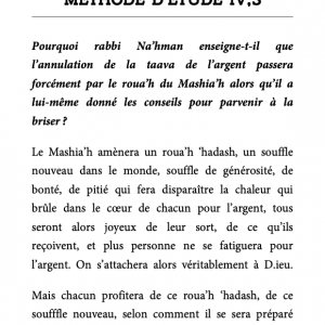 Ce livre est une étude de la Torah 13 de la première partie du Likoutey Moharan, dans laquelle rabbi Na’hman nous aide à sortir de la servitude du travail, des pièges et séductions de la société qui font de l’argent un but plus qu’un moyen et nous font croire que pour réussir sa vie, il faut beaucoup d’argent, beaucoup travailler, quitte à sacrifier beaucoup.