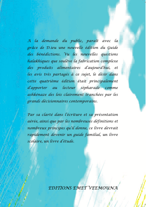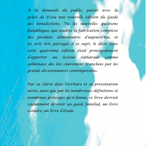 Pour la quatrième édition de ce livre, nous avons décidé de diviser le livre en deux, le Tome 1 consacré uniquement aux bénédictions sur les aliments et les parfums, et le Tome 2 (à venir) à toutes les autres bénédictions.
