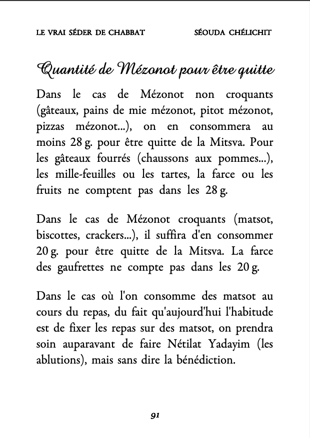 Dans le Tome 2, on trouve ce qui concerne manger ou boire avant la prière du matin pour les hommes et pour les femmes, les halakhot du Kiddouch midi et les bénédictions à faire lorsqu’on fait Kiddouch gâteau suivi de Motsi, l’importance du deuxième et troisième repas de Chabbat, les Halakhot de Séouda Chelichit, notamment un tableau des délais de consommation pour une Séouda Chelichit commencée après le coucher du soleil, Les Cheva Berahkot au cours d’une Séouda Chelichit, La Havdala et les différents cas selon les fêtes, le sens de chaque bénédiction, et les halakhot sur les parfums, le temps limite de récitation de la Havdala, la Séouda réviit et son importance, le Kriat Chéma al Hamita du samedi soir, le Tikoun ‘Hatsot, son importance, ses bienfaits, ses horaires et halakhot.